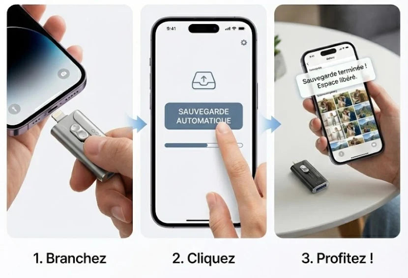 Aucune compétence technique requise. Branchez la clé, appuyez sur "Sauvegarder" et laissez la magie opérer.